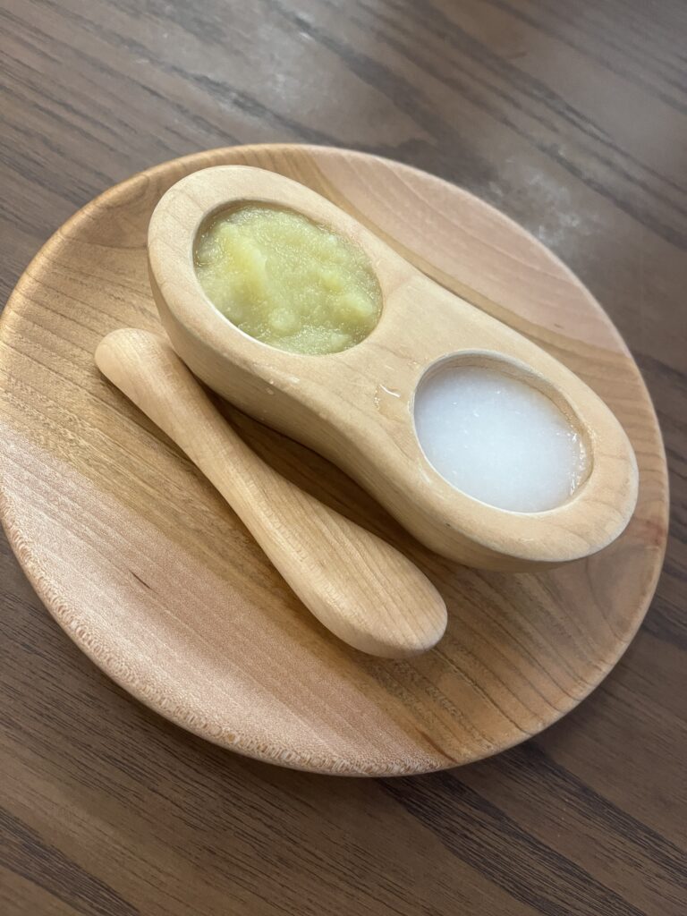 今回は生後6カ月の娘に「初期メニュー(さつまいもとりんごのマッシュ+10倍がゆ)」をお願いしました。