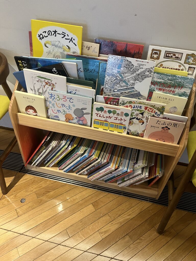壁際には絵本棚やおもちゃがあり、食事を待つ間も子どもが退屈しにくい工夫がされています。