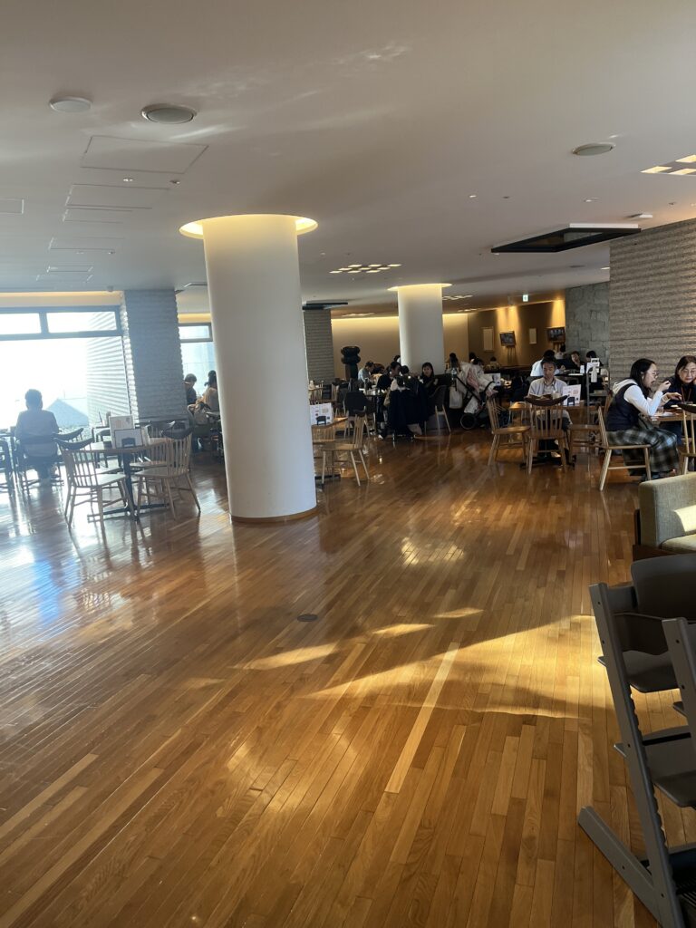 大きな窓から光が差し込んでいて、美術館併設らしい静かで落ち着いた雰囲気です。